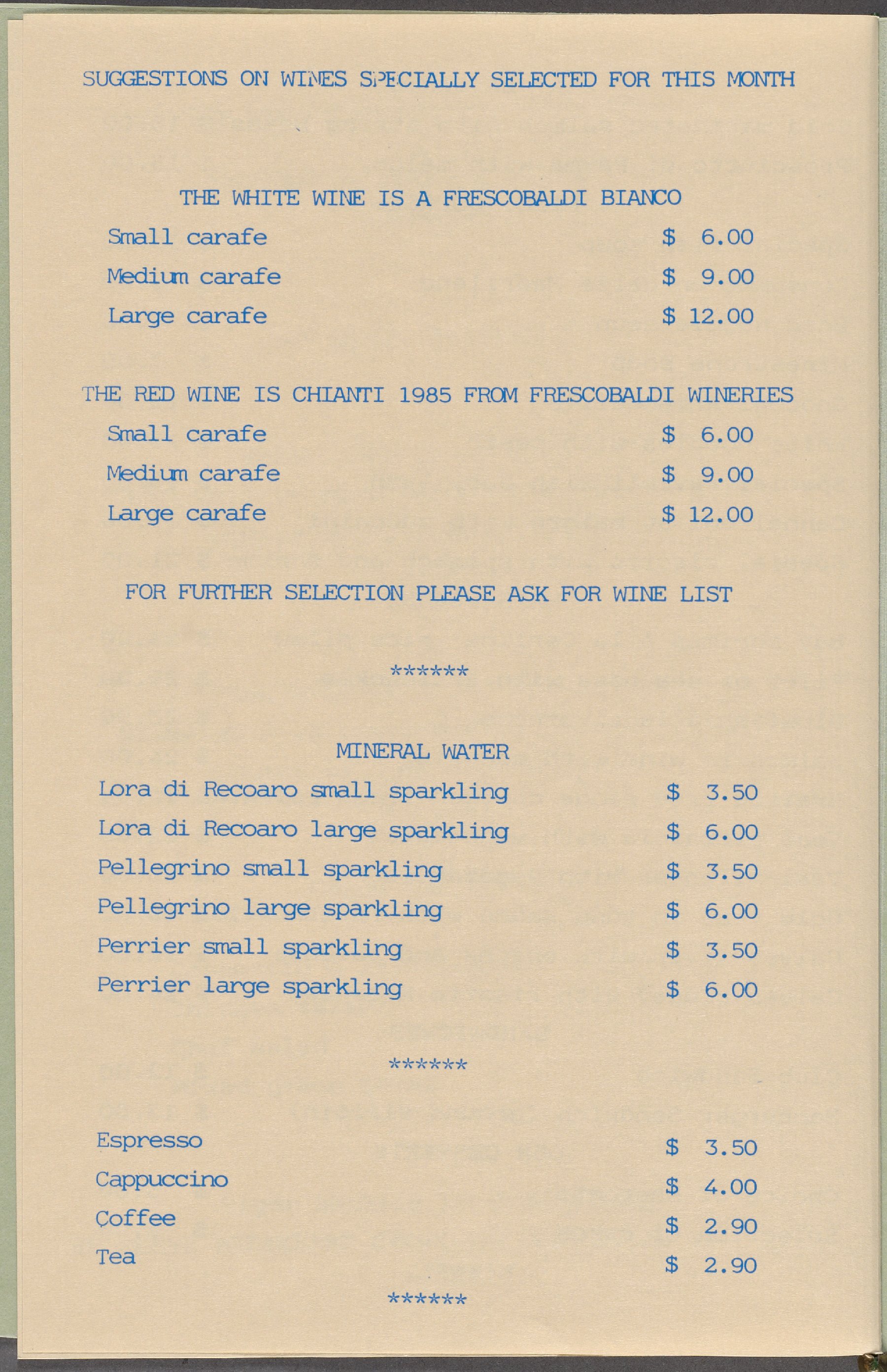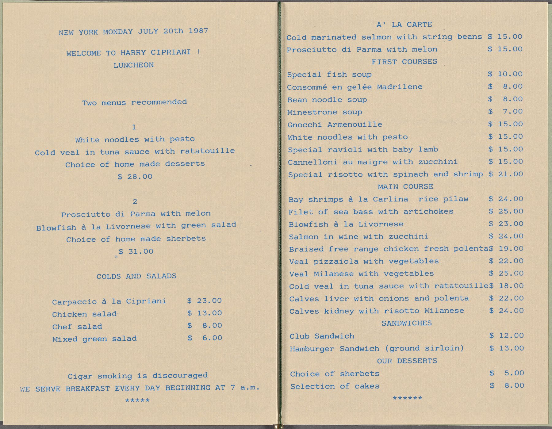 Cipriani's Menu Archive